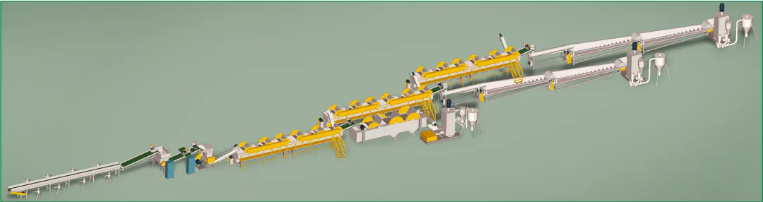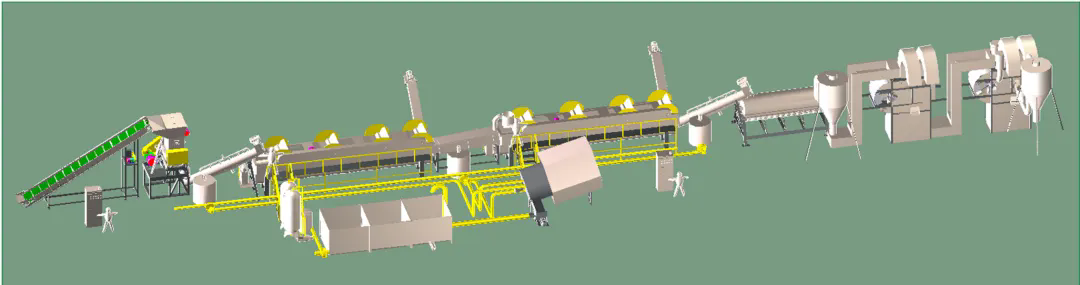 柯達(dá)機(jī)械制造各類型再生塑料全套破碎清洗分離生產(chǎn)線,與Toplun(菲律賓)、KSI(馬來西亞)、泉源塑膠(印尼)、新華泰(泰國(guó))、海鹽海利等PET再生利用大型生產(chǎn)廠家合作,大部分客戶清洗的PET切片均對(duì)接Adidas,Nike等世界知名企業(yè),柯達(dá)機(jī)械PET工藝略異于市場(chǎng)生產(chǎn)線,多出市場(chǎng)上的冷熱預(yù)洗及堿洗后增加酸性中和清洗,在整個(gè)工藝中務(wù)求減少PET切片的刮痕損傷,降低粉末損耗率,快速酸性中和保固PET成品料粘度。每個(gè)工序點(diǎn)都為生產(chǎn)出高粘度,低損耗PET成品而設(shè)計(jì)。